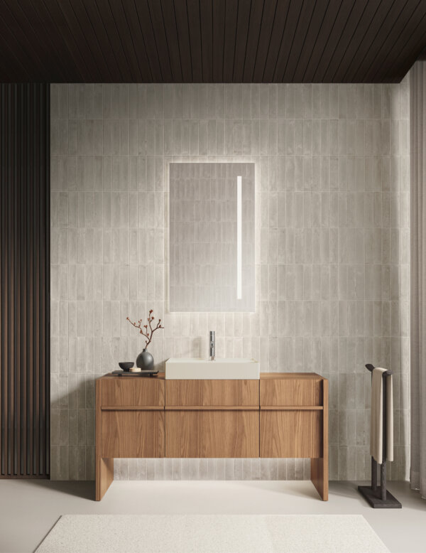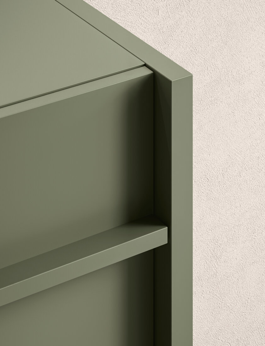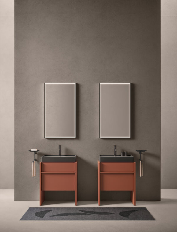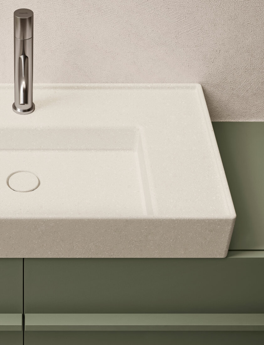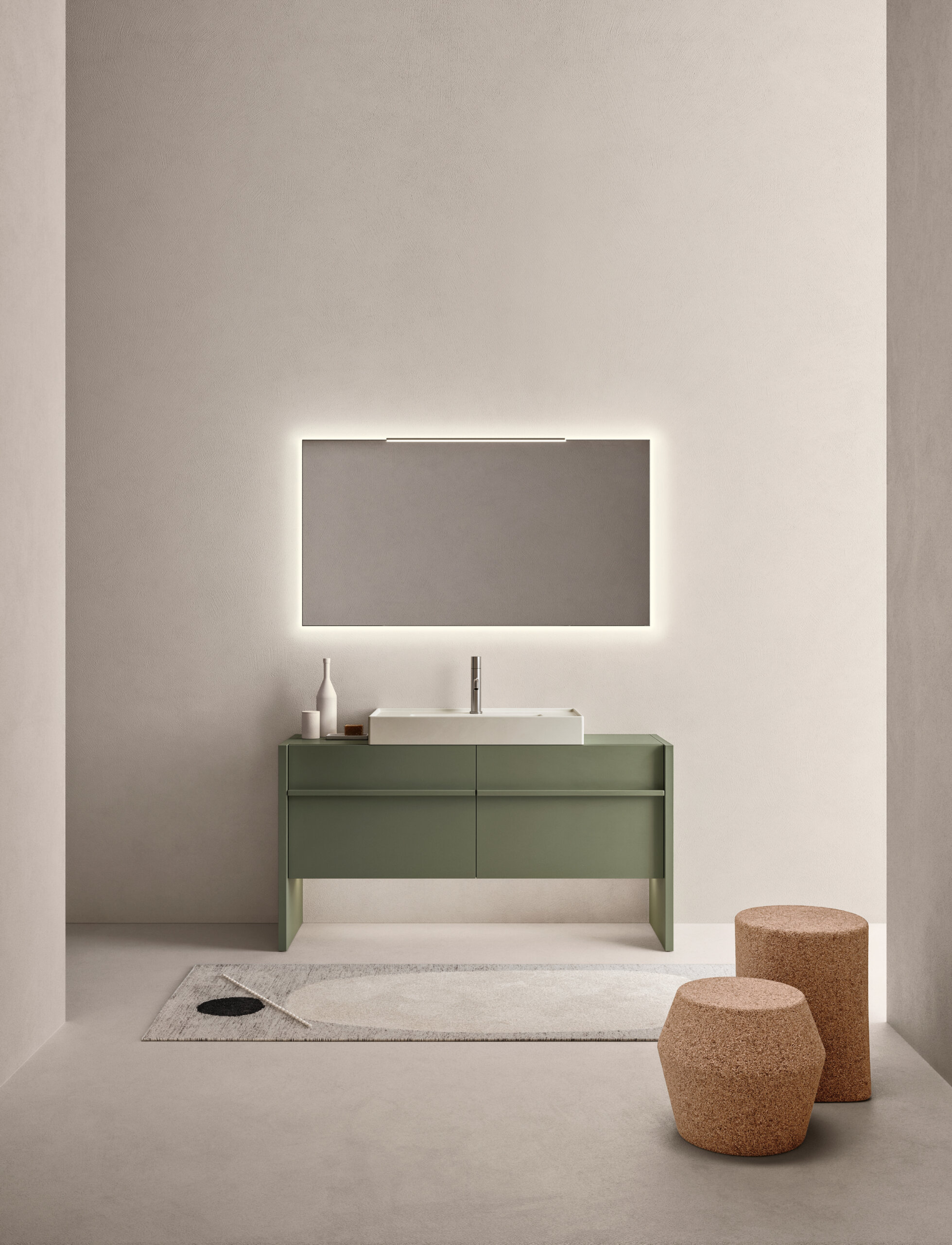 Composizione Franq L 146,2 composta da due fianchi di finitura L 3,1 H 77 P 49, una base lavabo con due cassetti L 140 H 50 P 45,7 completa di top in laccato Salvia opaco. Lavabo Franq 80 in Cristalplant Stratum Alba. Illuminazione a LED per basi al metro lineare L 140. Specchiera Vetra con retroilluminazione a LED 4 lati H 75 L 140 P 2,8. Lampada Linus 72 a LED. Rubinetteria Flute L03 in acciaio satinato. Pouf Maki 1, Maki 2 in sughero naturale. Tappeto Lidi 04 W.