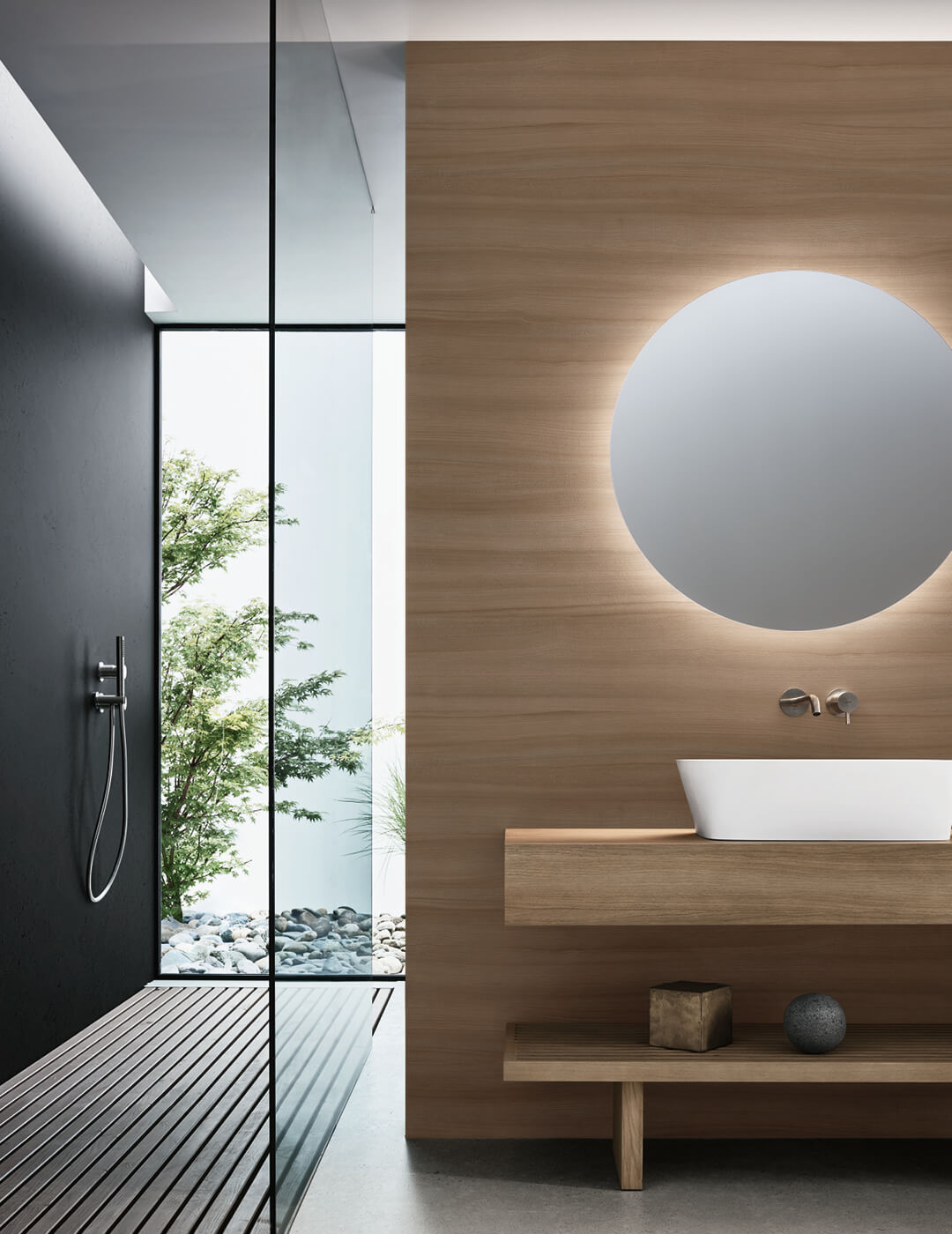 Azuma 58 Cristalplant sit-on washbasin. Wall-hung top with Rovere Miele folding processing drawers. Zen bench with Rovere Miele strips. Air mirror with LED backlight. Azuma wall-mounted bathtub with Cristalplant tap holder, Loto Rovere Carbone trays. Levante two panels mirrored screen, with Rovere Miele strips or Sesamo finish fabric upholstered panel. Toro series Rovere Carbone chair. Toro series Rovere Miele wall-mounted coat rack. Black cork Maki pouf.