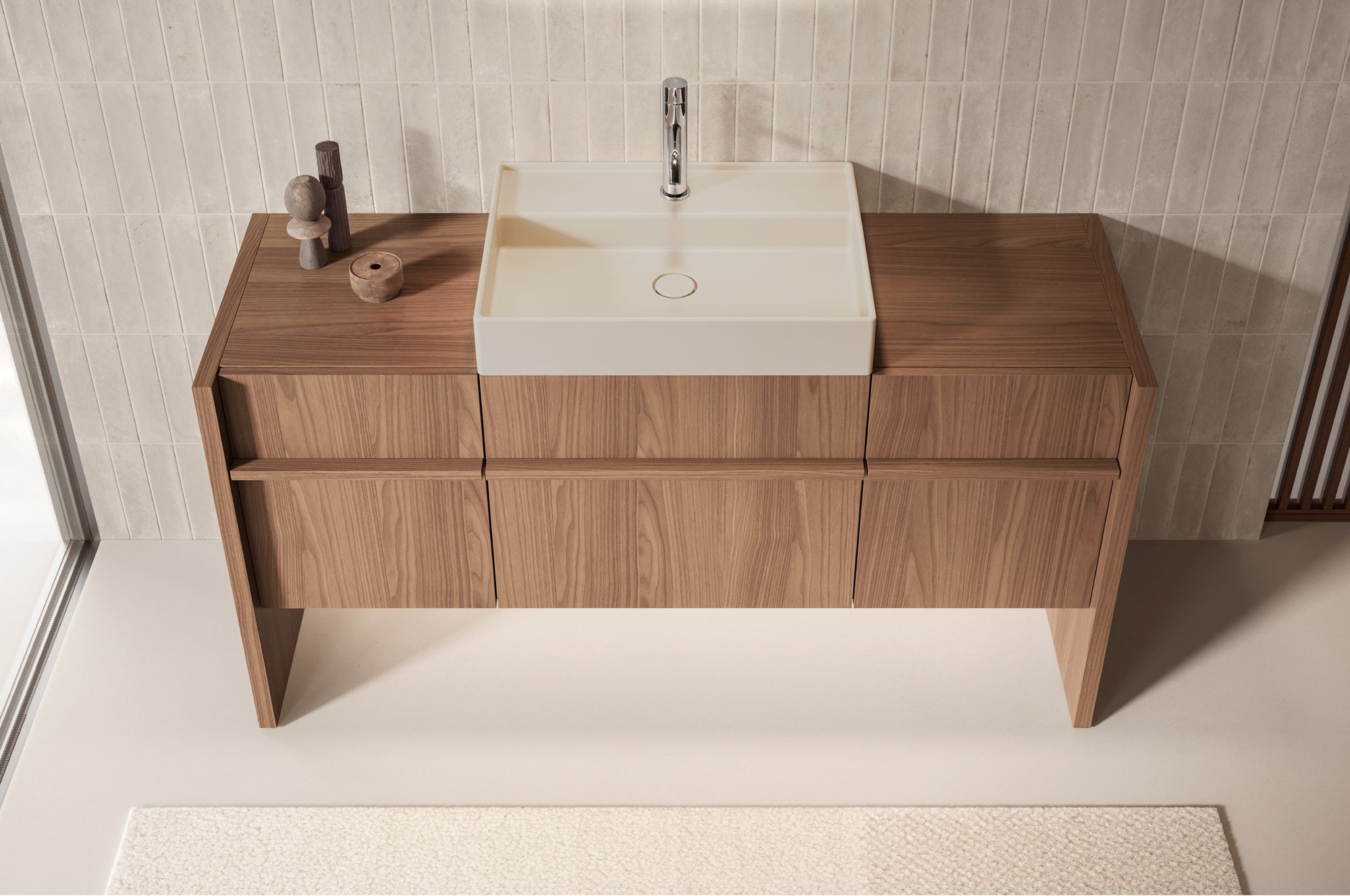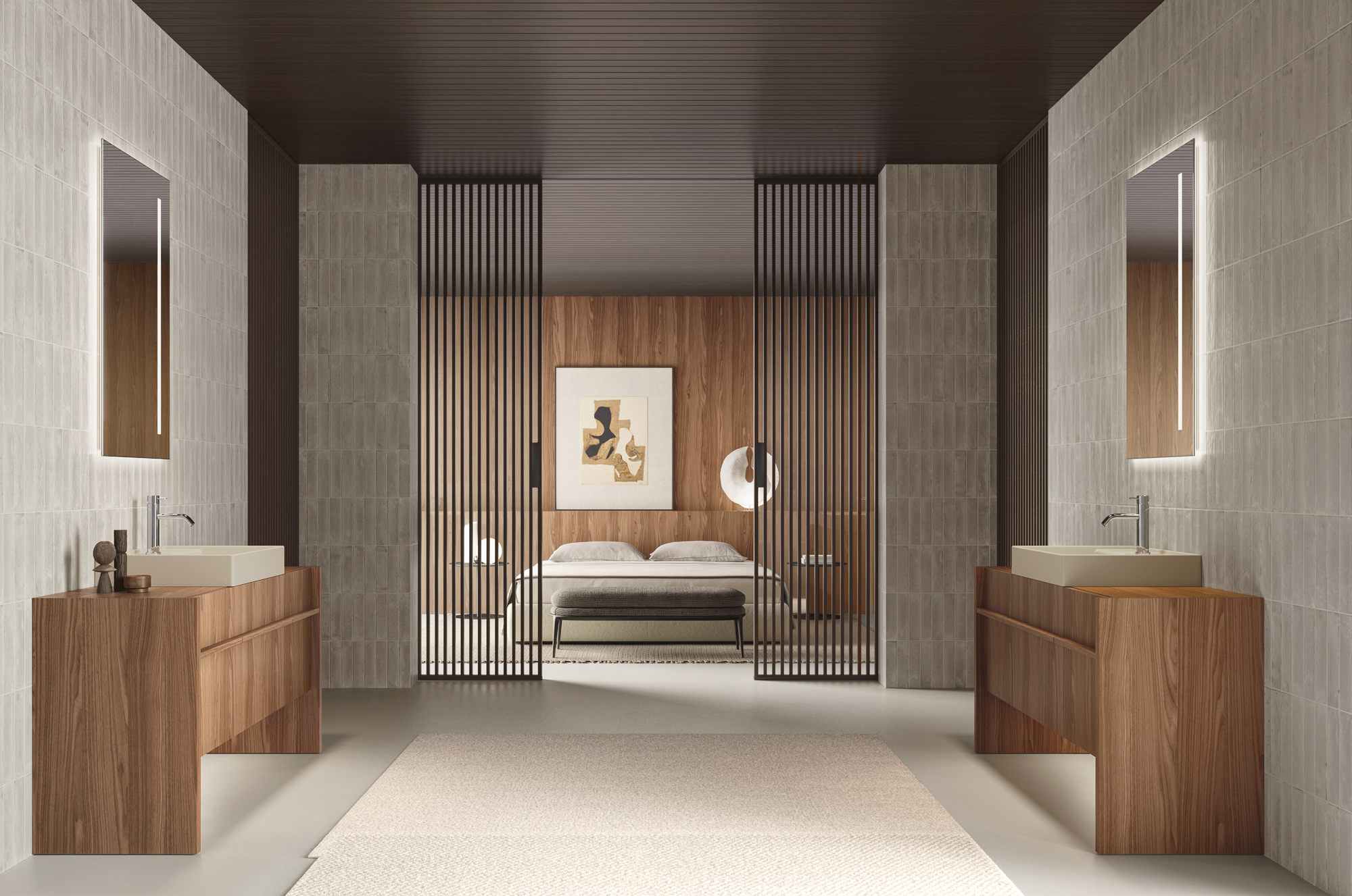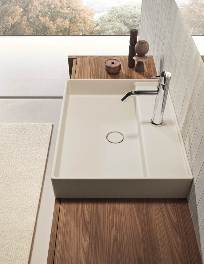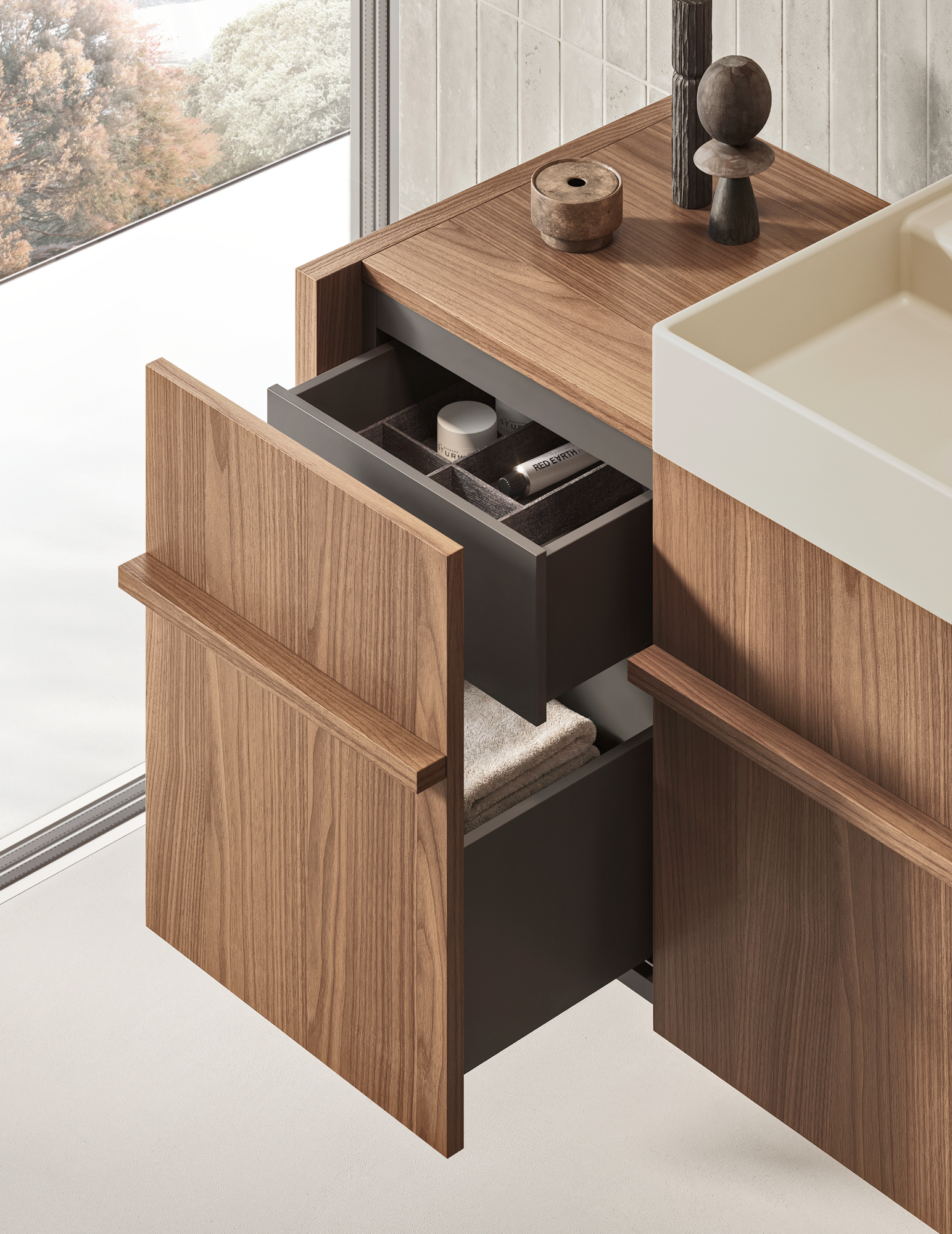 Franq composition W 146.2 composed of two finishing sides W 3.1 H 77 D 49, two base units with drawer W 40 H 50 D 45.7 with internal drawer, one washbasin unit with drawer W 60 H 50 D 45.7 complete with top in Noce Canaletto. Franq 60 washbasin in Cristalplant Luna matt lacquered. LED lighting for bases L 140. Flow L03 polished steel tap. Linea mirror with vertical etched band and four-sided LED backlighting W 60 H 105 D 2.8. Toro Rovere Carbone towel rack.