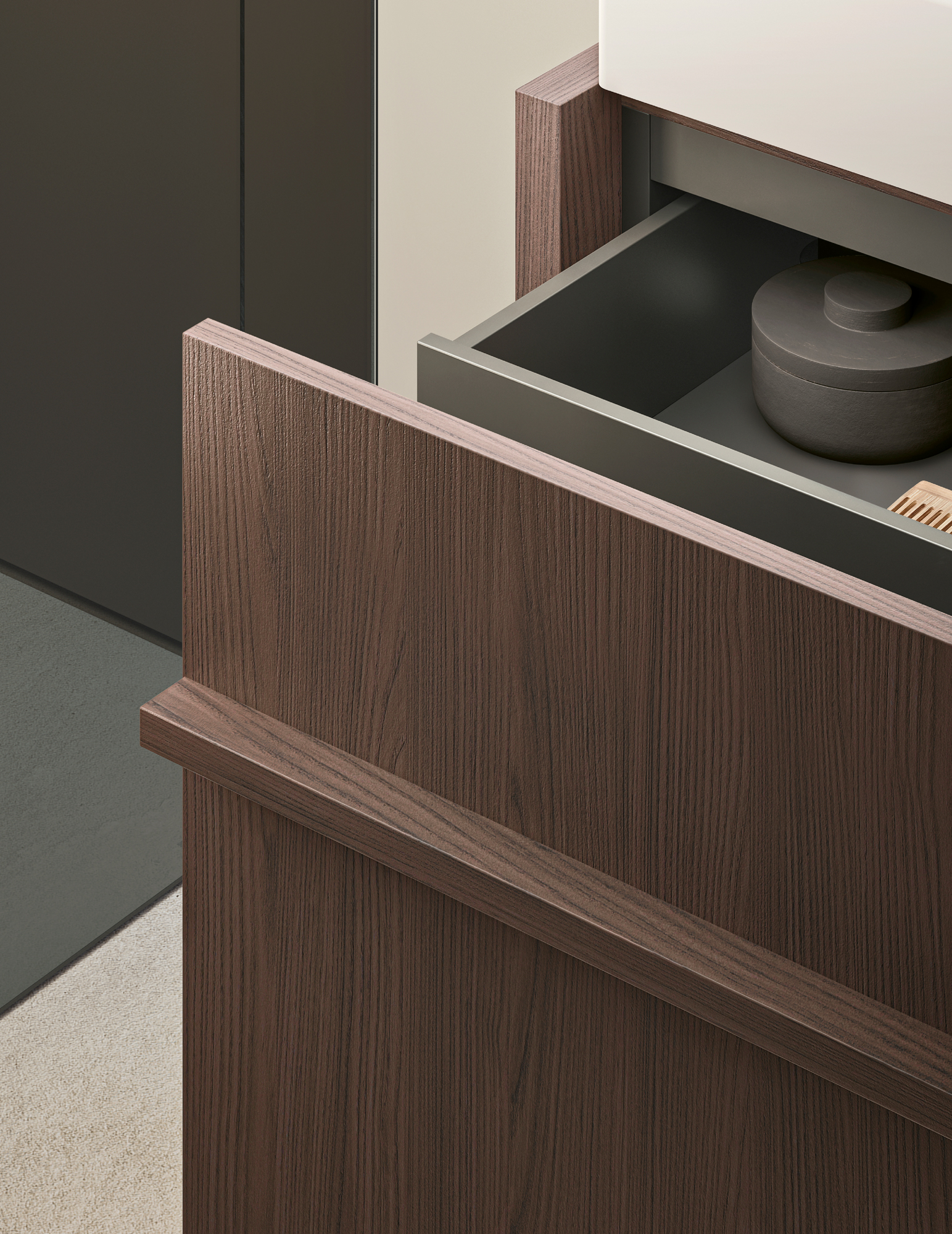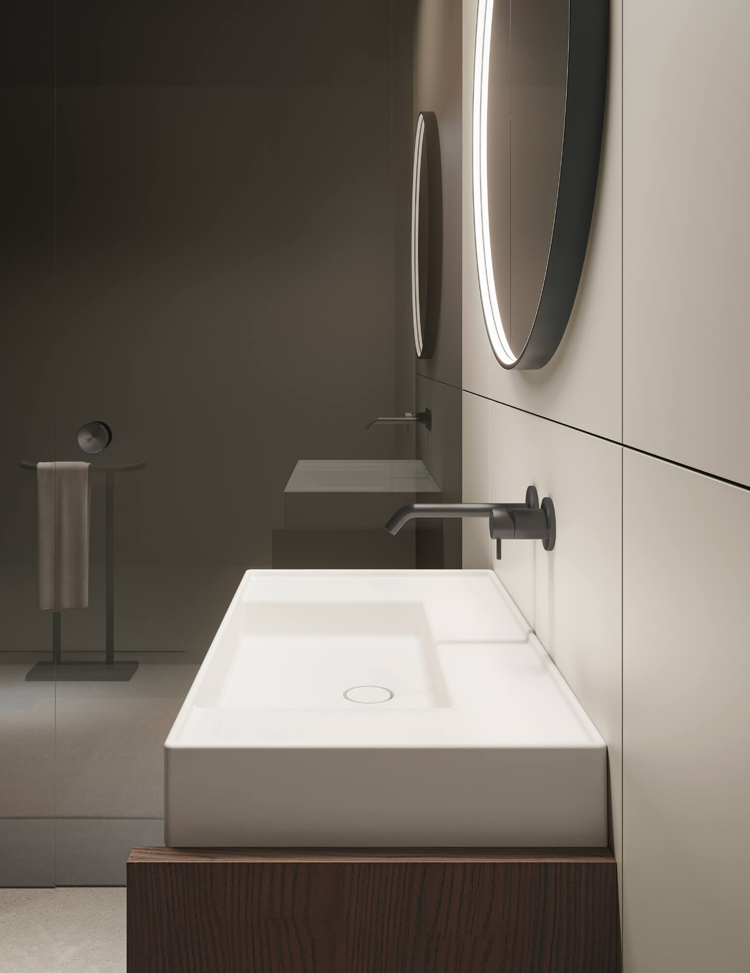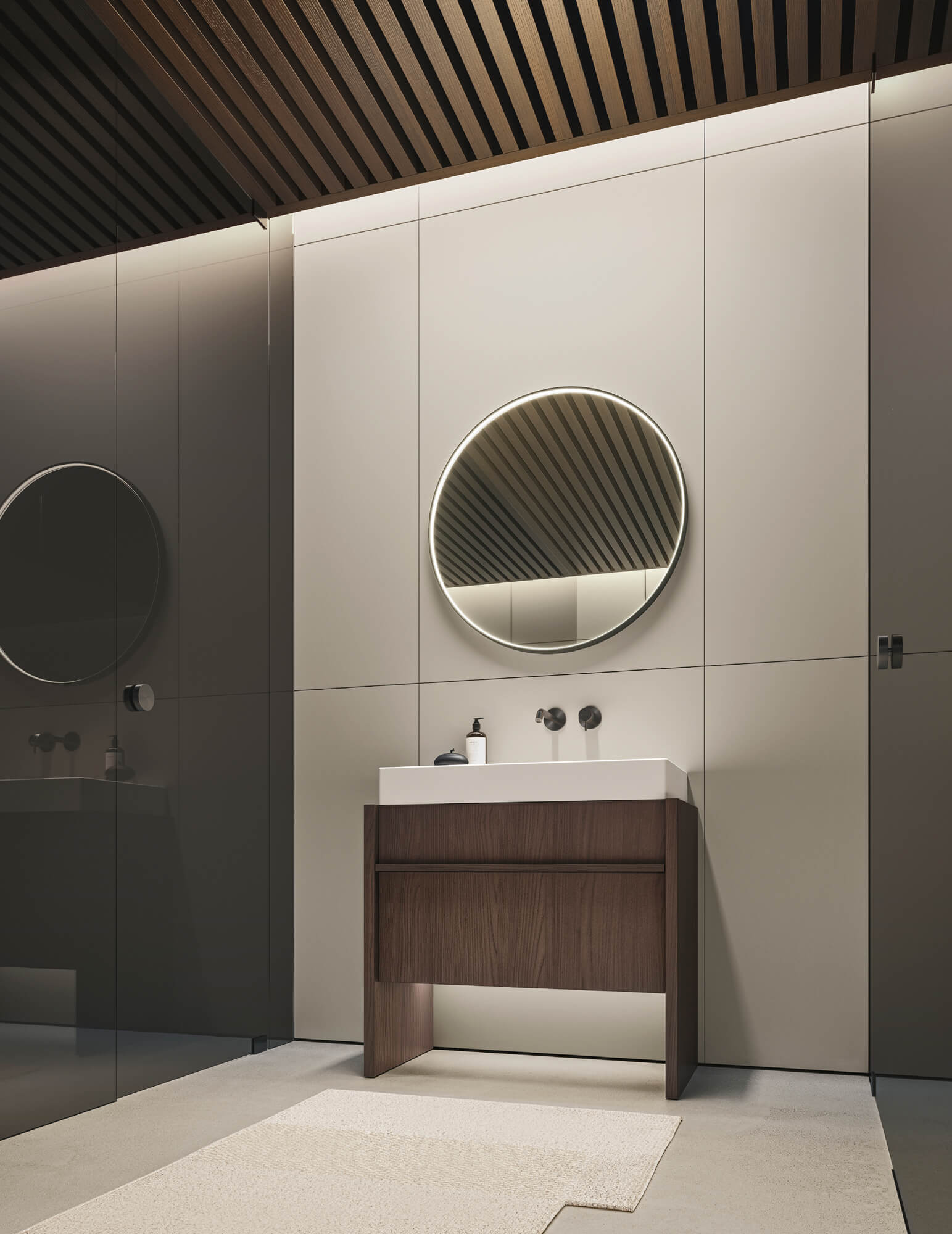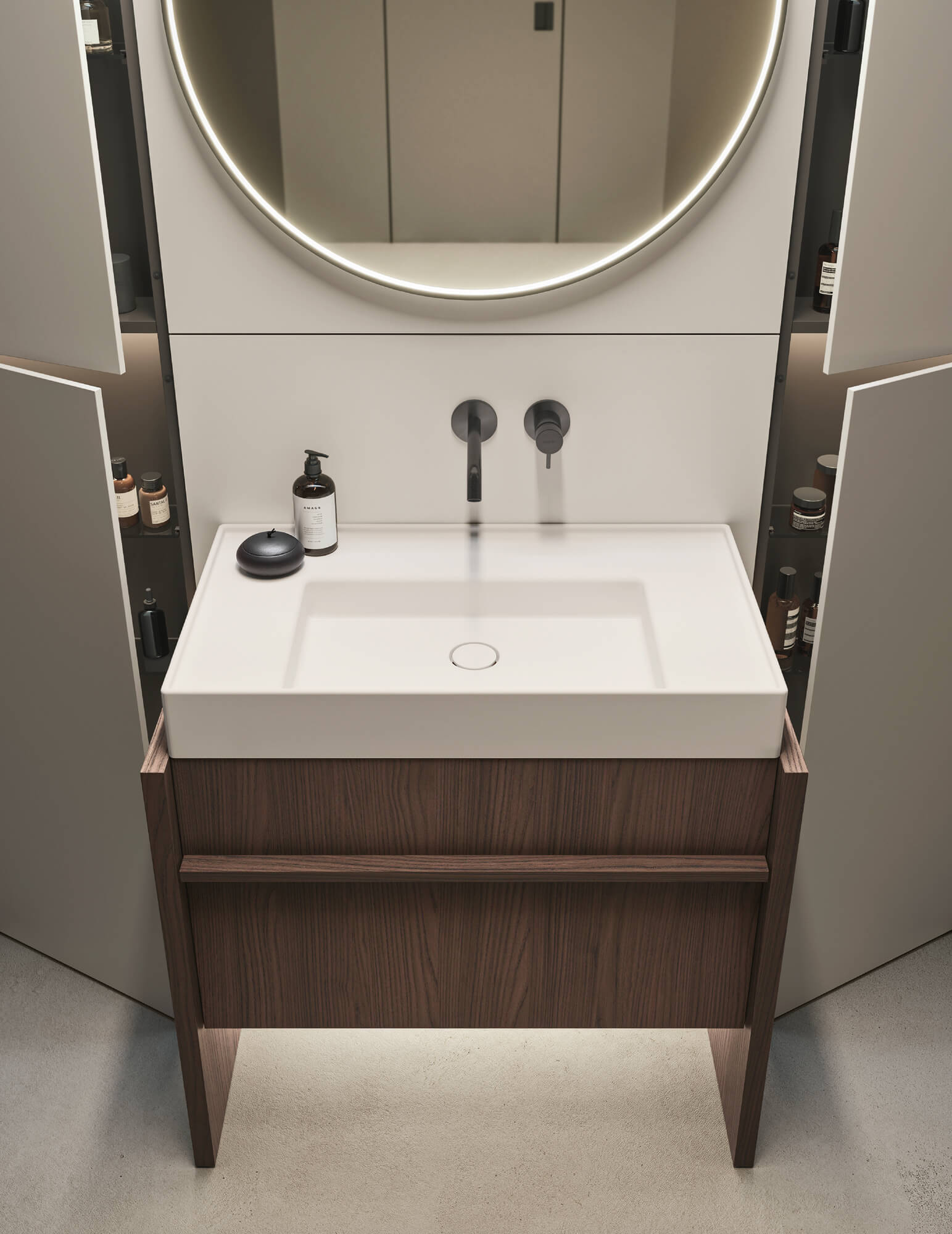 Composizione Franq L 86,2 composta da due fianchi di finitura L 3,1 H 77 P 49, una base lavabo con cassetto L 80 H 50 P 45,7 con cassetto interno, completa di top in Venato Moro. Lavabo Franq 80 in Cristalplant. Illuminazione a LED per basi al metro lineare L 80. Specchiera Frame C profilo nero con illuminazione interna Ø 81 P 4. Composizione Caba L 180 composta da due colonne 2 ante con illuminazione interna L 45 H 238 P 15,3 e una colonna con elemento fisso porta rubinetto L 90 H 238 P 15,3 custom in Sillmatt Greige. Rubinetteria Flow L01 in PVD Nero. Portasciugamani Toro in Rovere Carbone. Tappeto Plain 02 W.