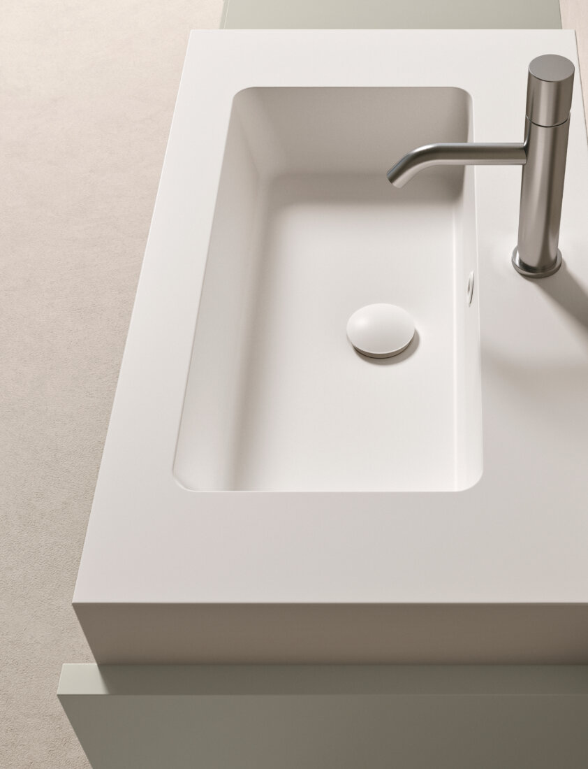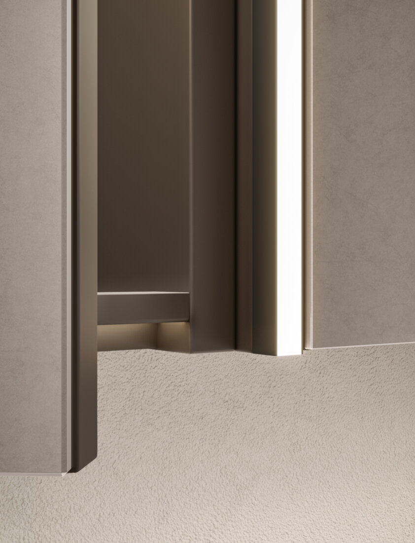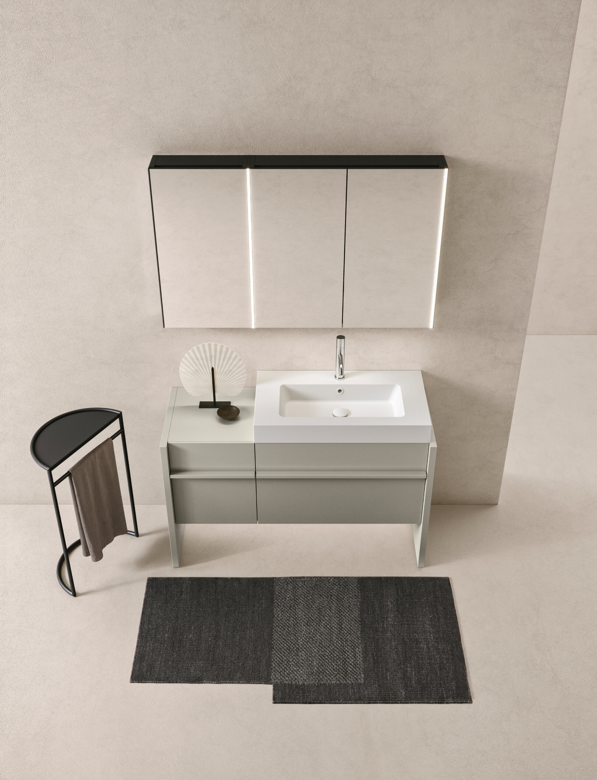 Franq composition W 126.2 composed of two finishing sides W 3.1 H 77 D 49, one base unit with drawer W 40 H 50 D 45.7, one washbasin unit with drawer W 80 H 50 D 45.7, complete with top in matt lacquered Agata. Kappa console in Ceramilux W 80.5 H 10 D 46. LED lighting for base units W 120. Flute L03 tap in polished stainless steel. Semi-recessed mirror cabinets with lower LED lighting: one with single door W 40 H 75 D 4.5, one with two doors W 80 H 75 D 4.5, and two mirror finishing sides; two Mark lamps. Roma towel rack in matt black. Plain 02 B carpet.