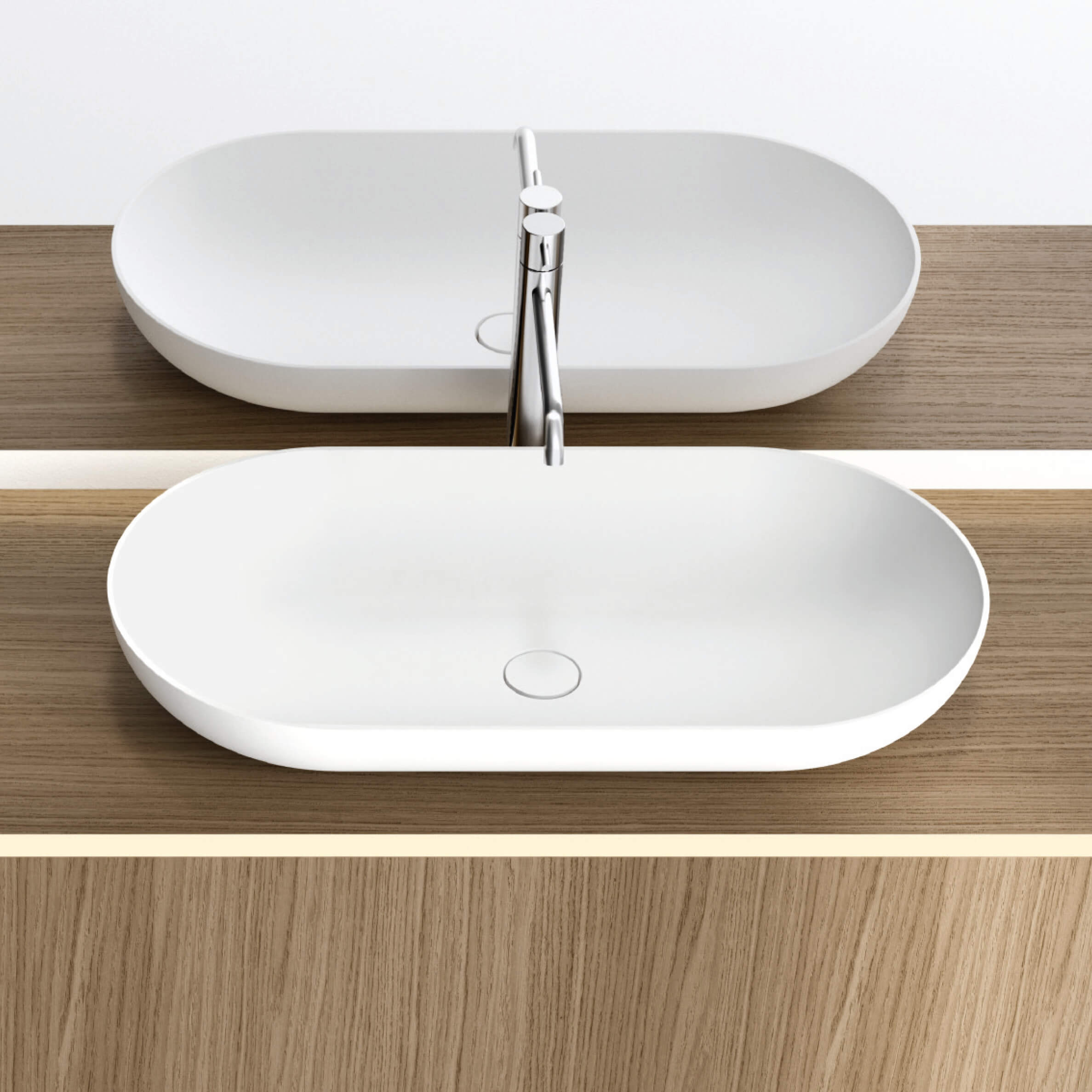Puro W 202 composition composed of two finishing sides W 2, one base unit with drawer and open compartment with LED lighting W 72 H 35.5 D 51 and a washbasin base unit with drawer W 126 H 35.5 D 51 in Rovere Miele. Linear top in Rovere Miele W 202 with LED lighting. Blend 81 Cristalplant sit-on washbasin 8888. Vetra mirrors with 4-sided LED backlighting W 72 H 120 D 2.8 and W 126 H 120 P 2.8. Toro series towel racks in Rovere Carbone. Flow L04 polished steel tap. Plain 03 W carpet.