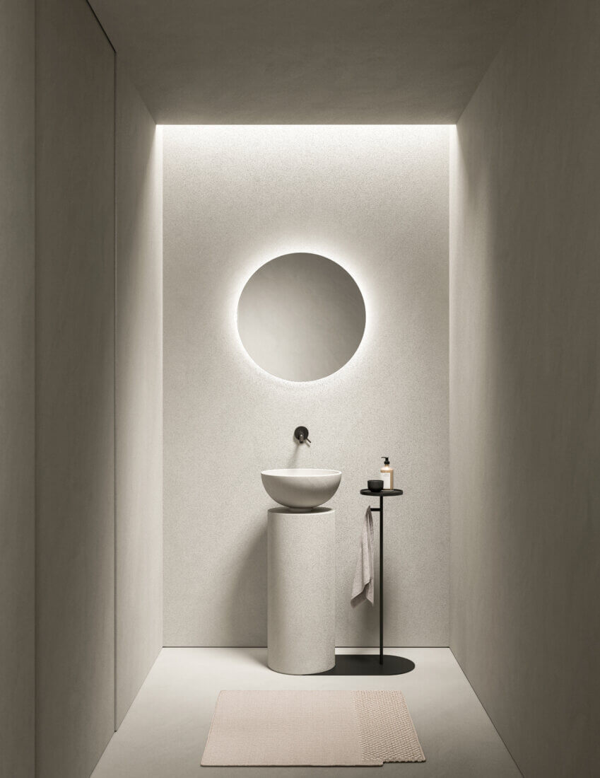 Saba is a column washbasin with a timeless feel, quite a statement in its radical simplicity. Its minimalist archetype shape allows the use of different finishes and materials, fitting in both indoor and outdoor settings. A peace capable of characterizing an architecture but at the same time discreet, able to fit harmoniously into both classic and contemporary spaces, both domestic and public. Saba washbasins are available in marble, concrete, clay and lacquered, in a single material version or with a base in the different wooden essences of the collection.