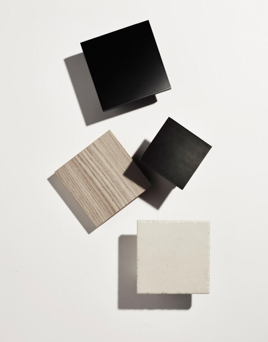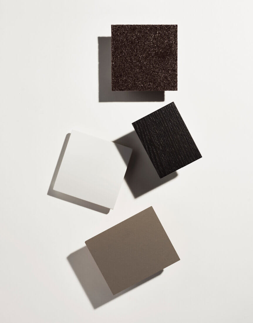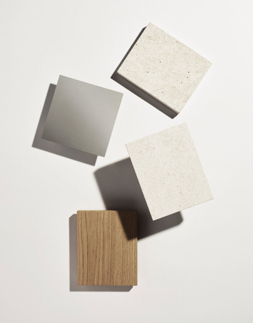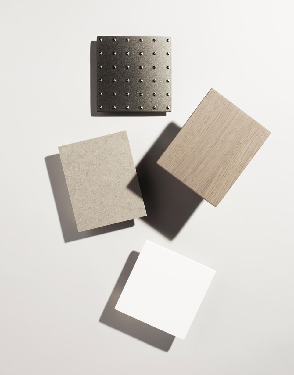 The Noorth collection of materials and finishes includes wood essences, stones, concrete surfaces, clays, melamine finishes, and lacquered colors, each defined by a strong tactile and visual identity.